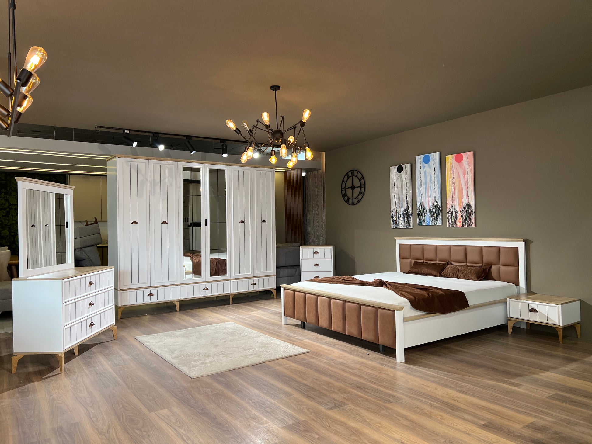Erleben Sie klassische Eleganz mit unserem Schlafzimmerprogramm „Line“. Das schöne Bett mit großzügiger Rückenlehne und einem braunen Stoffbezug, verziert mit stilvollen weißen Akzenten, schafft eine einladende Schlafumgebung. Der geräumige Schrank überzeugt mit zwei Spiegeltüren in der Mitte, weißen Türen an der Seite und drei Fächern unterhalb der Türen, was für optimale Aufbewahrungsmöglichkeiten sorgt. Zum Set gehören außerdem eine attraktive Kosmetikkommode mit Spiegel, eine separate kleine Kommode und zwei stilvolle Nachttische, alles in klassischem Weiß. Mit „Line“ schaffen Sie ein zeitloses Schlafzimmer, das Stil und Funktionalität elegant vereint.