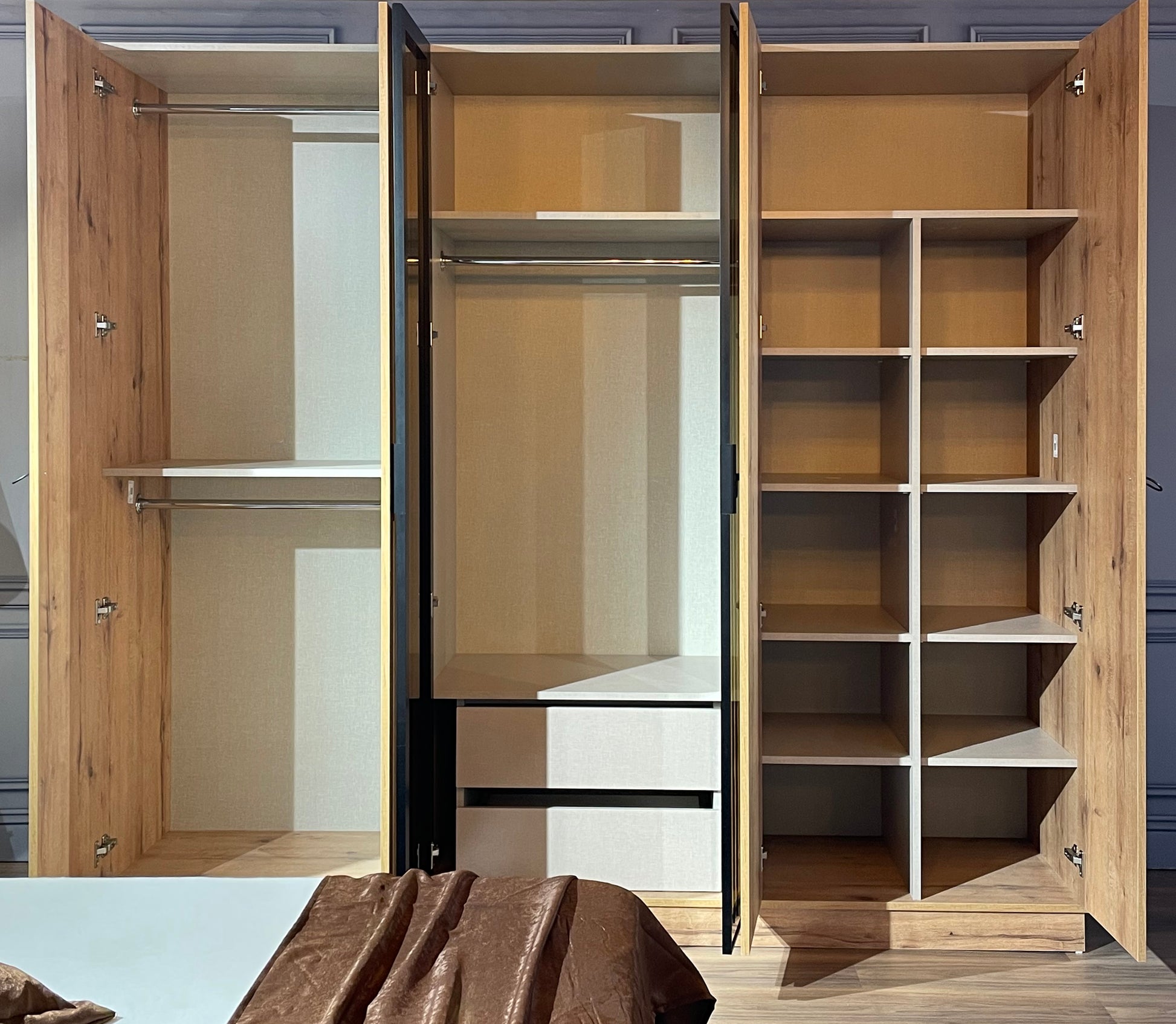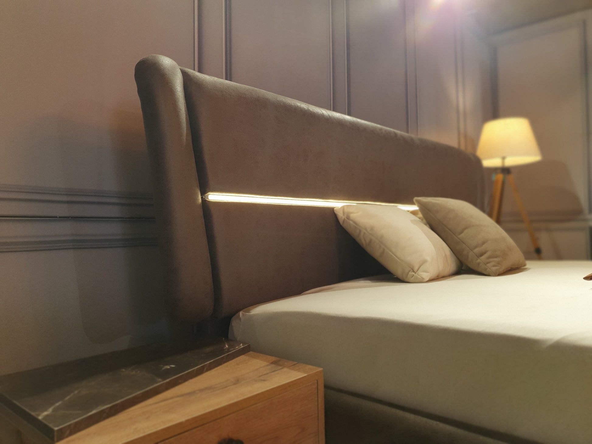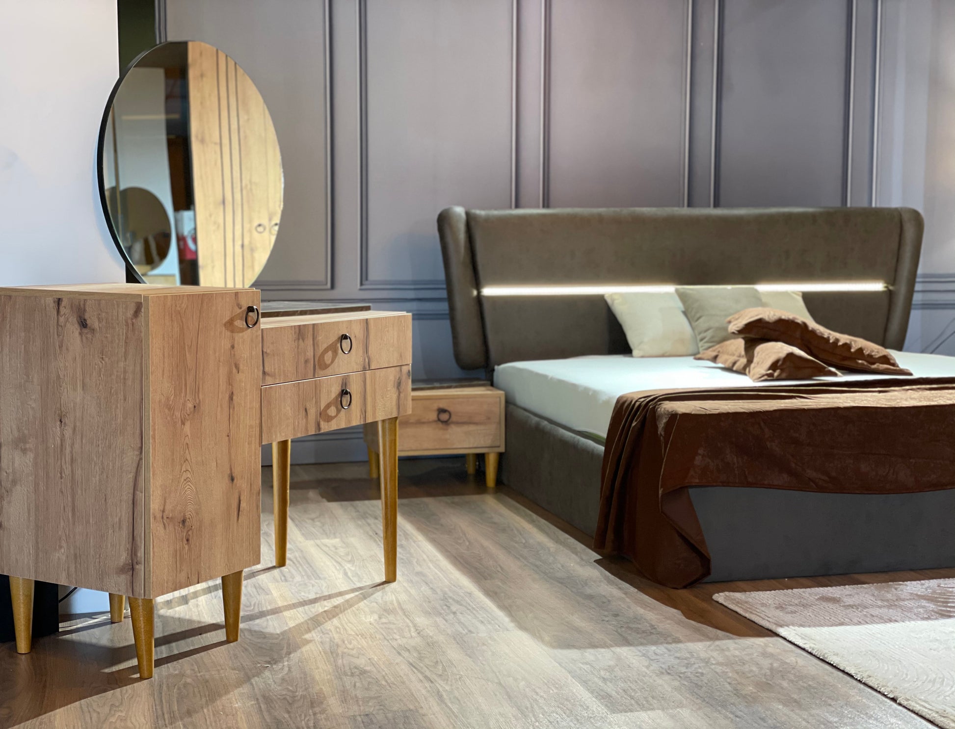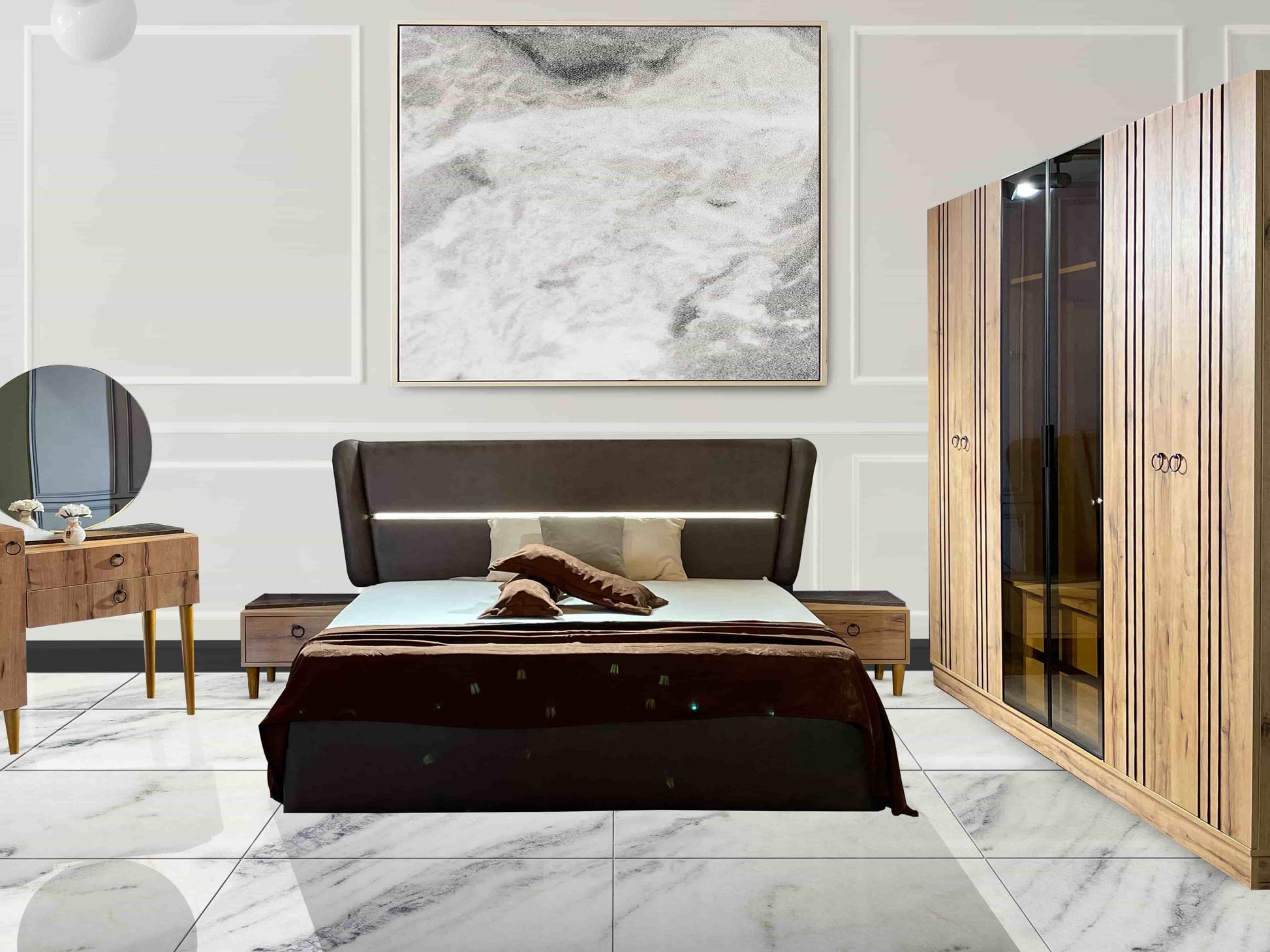 Përjetoni bukurinë dhe funksionalitetin e përjetshëm me dhomën tonë të gjumit "Detroid". Ky komplet përfshin një gardërobë të bollshme, një krevat simpatik me tapiceri elegante prej pëlhure dhe një shirit LED elegant në mbështetësen, si dhe dy komodina të përshtatshme dhe një komodë kozmetike - të gjitha në një pamje simpatike prej druri. Me "Detroid" ju mund ta transformoni dhomën tuaj të gjumit në një vend relaksi dhe elegance.
