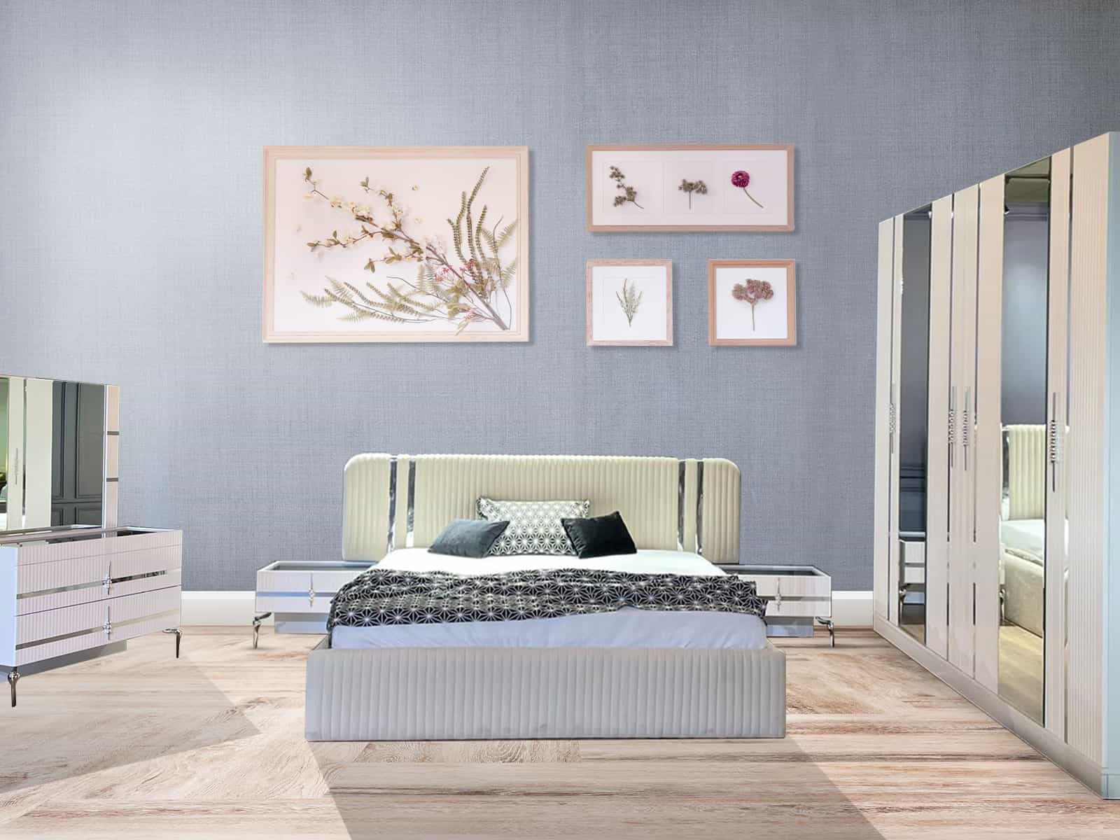 Përkëdhel veten me ofertën tonë të dhomës së gjumit "Diva". Shtrati mbresëlënës me një mbështetëse bujare dhe një mbulesë delikate prej pëlhure të bardhë ju fton të relaksoheni dhe të ëndërroni. Dollapi i gjerë bën përshtypje me dyert e ndritshme dhe pasqyrat elegante në dyert anësore, duke krijuar një kombinim elegant pa kohë të vijave të pasqyrës dhe të bardhës delikate. Seti plotësohet nga një gjoks tërheqës kozmetik i sirtarëve dhe dy tavolina me stil shtrati. Me "Diva" ju i jepni dhomës tuaj të gjumit një prekje të shkëlqimit dhe bukurisë së përjetshme që do t'ju bëjë të ndjeheni si një diva e vërtetë natën pas natës.