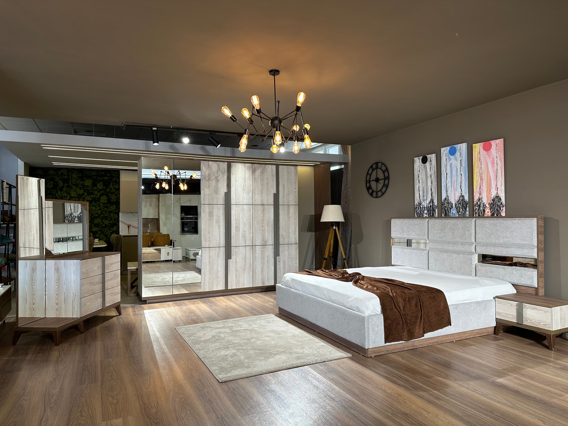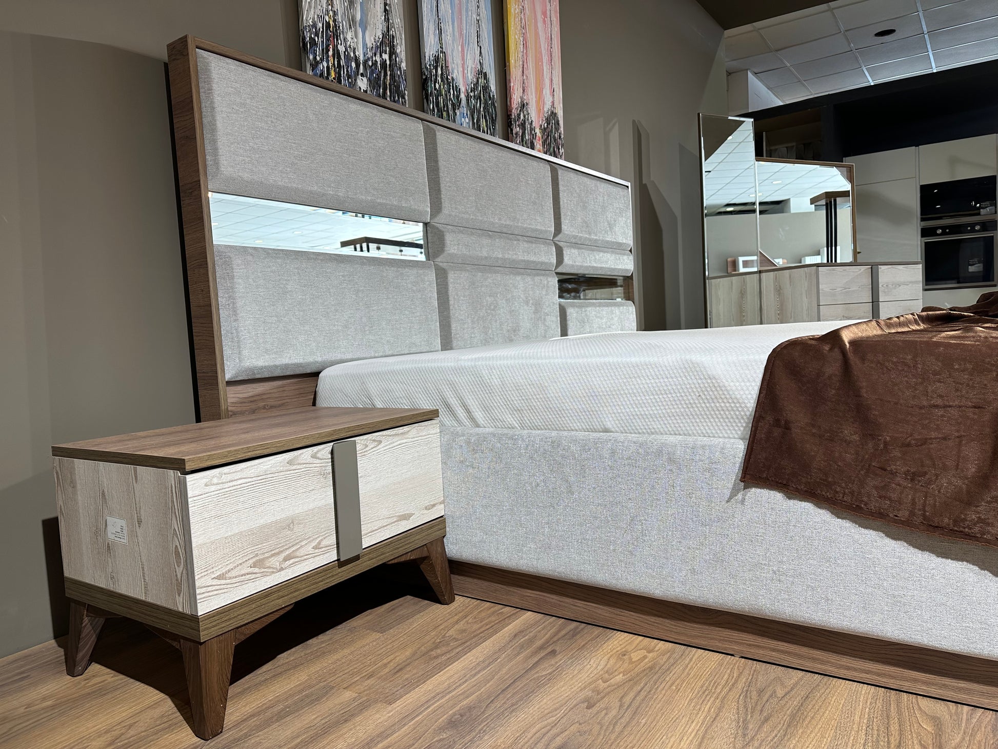 Shtoni një prekje moderne dhe elegante në dhomën tuaj të gjumit me gamën tonë të dhomës së gjumit Oslo. Shtrati tërheqës me mbulesë prej pëlhure gri të çelur dhe pjesë të vogla pasqyre në mbështetëse krijon një ambient tërheqës. Dollapi i gjerë kombinon me zgjuarsi grinë e lehtë me një pamje druri me një pjesë pasqyre dhe dyer.